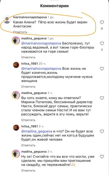 Комментарии под видео*"Вдовцу Заворотнюк приписали роман с какой-то загадочной Аленой, но тут пришла Потапова и заявила, что он до конца жизни будет одинок. Бедный Пётр. Он так достоин счастья", — отметили, в свою очередь, админы канала. В комментариях люди поддержали негодование и выражают недоумение, почему Чернышёв не должен больше строить личную жизнь: "А что, теперь человеку всю жизнь оставаться одиноким?", "Жизнь продолжается, и Петру надо жить, он имеет право на личную жизнь", "Нельзя скорбить всю жизнь. Если он найдёт спутницу, этим он никак не оскорбит память Анастасии. Уверена, он останется верен ей сердцем и душой", "Какое осуждение может вообще быть? Он что, преступление совершил? Он не меньше других заслуживает и имеет права на счастливую жизнь".