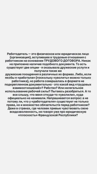В своём инстаграме* Максимова заявила, что в период работы на Литвинову у неё не было официального трудового договора, то есть фактически она работала незаконно: "Никак не припомню наличие подобного документа. То есть я оказывала дружеские услуги и получала такие же дружеские поощрения. Работа совершалась в формате, не подкреплённом документально. Это какой вид "трудовых взаимоотношений"? Рабство? Или нелегальное использование рабочей силы?" — публично поинтересовалась она, намекнув, что готова искать правды в суде.