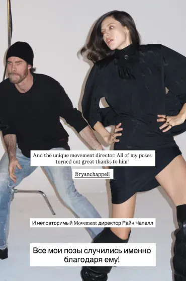 Ксения Шипилова с командойБольше всего Ксению, которая в России сотрудничает со стилистом Ксенией Смо, вдохновила работа с постановщиком поз и хореографом Райаном Чапеллом. "С [ним] работают Jacquemus, Gucci и Louis Vuitton. Он бывший танцор. Его задача — не поставить позу, а раскрыть тебя через движение. Работа с ним — кайф и настоящий мастер-класс по актёрскому мастерству".