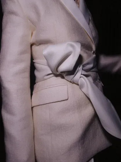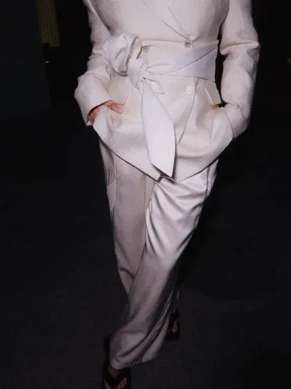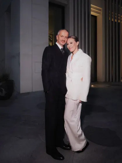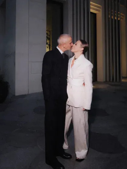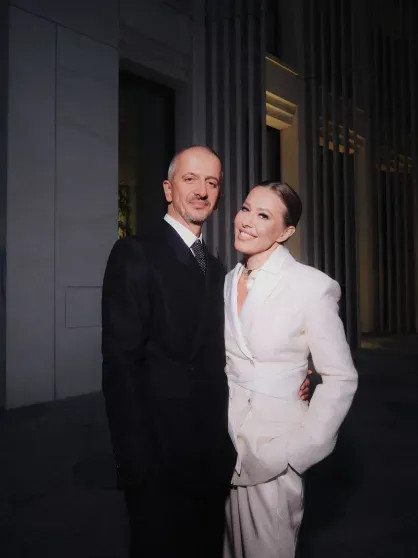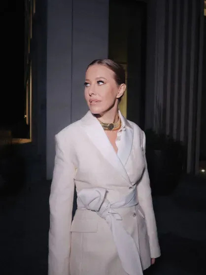 Для небольшой фотосессии 44-летняя Ксения примерила светлый костюм со струящимися брюками и атласной лентой на поясе от Alena Akhmadullina, колье Bvlgari и обувь Ruban. Богомолов позировал в чёрном костюме с белой рубашкой. На одном из снимков супруги позволили себе больше чувств и поцеловались.