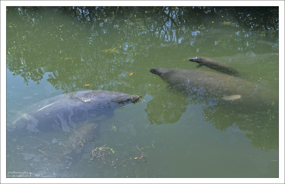 Мы стояли у самого берега, когда одна из мамаш подплыла чуть ли не вплотную. Исследования показали, что зрение у ламантинов слабое. Зато они обладают чутким слухом, и, судя по большим обонятельным долям мозга, хорошим обонянием. Ламантиха смешно раздувала ноздри на морде, и даже вроде как хрюкала. Ну или фыркала. Не знаю, чем мы заслужили такое внимание с их стороны, но сделав несколько кругов, мамаши с малышами чинно поплыли в сторону большой воды.