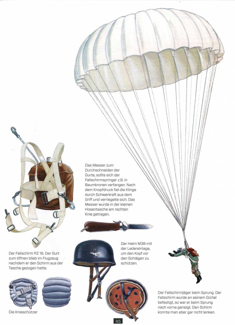 Парашютист и его снаряжение. Парашют крепится к поясу, поэтому десантник в полёте сильно наклонён вперёд и не может управлять планированием. Парашют RZ-16 с вытяжным фалом, остающимся в самолёте. Наколенники. Нож-стропорез. Шлем М38 с кожаным амортизатором.