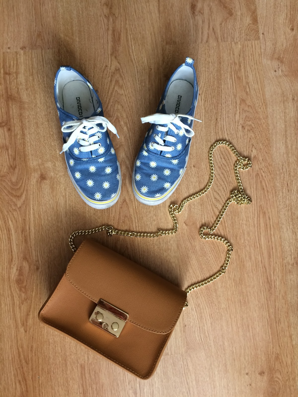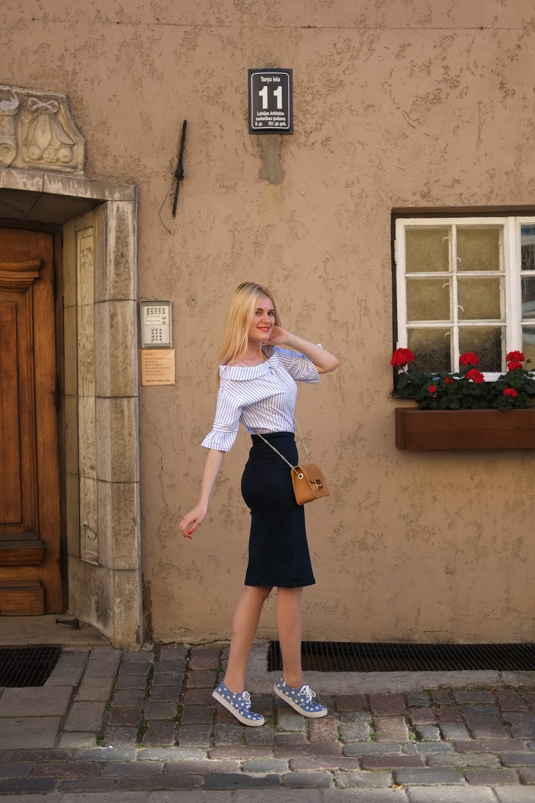 В общем, как и во всём хорошо соблюдать чувство меры. А для сегодняшней прогулки я выбрала полосатый топ с открытым плечом и узкую тёмно-синюю джинсовую юбку. Материал юбки приятно тянется и не стесняет движений. Несмотря на общий женственный вид и облегающий силуэт в такой одежде очень удобно. Так как гулять предстояло долго да ещё и по брусчатке, она у нас в Старом городе везде, то я надела удобные кеды с принтом в ромашки. Кожаная сумочка в тон волосам одна из любимых в моём гардеробе. Если в вашем городе прохладнее всегда можно прихватить с собой парку или бомбер нейтрального цвета. Вот такой кэжуал с оттенком элегантности получился у меня.