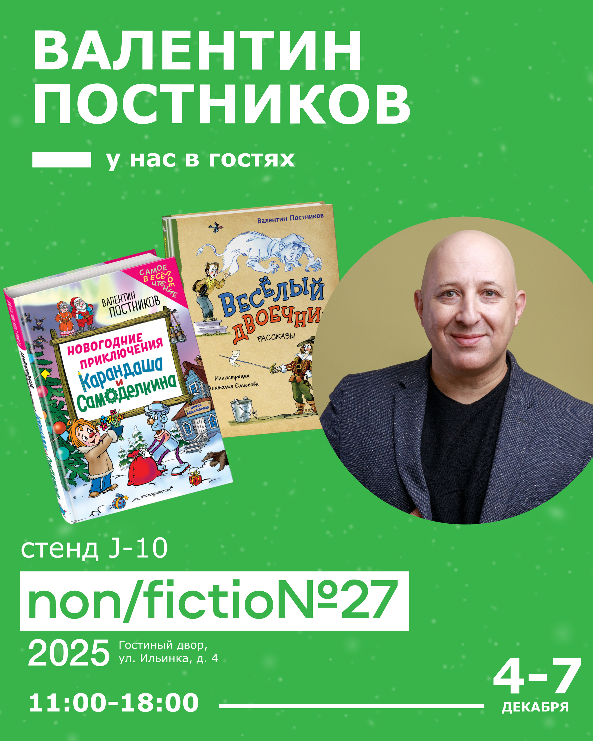 ● 5 декабря с 11:00 до 18:00 в рамках работы стенда J-10 пройдет встреча с арт-директором издательства Ильей Сауковым, а с 4 по 7 декабря — с автором историй о «Карандаше и Самоделкине» Валентином Постниковым.
