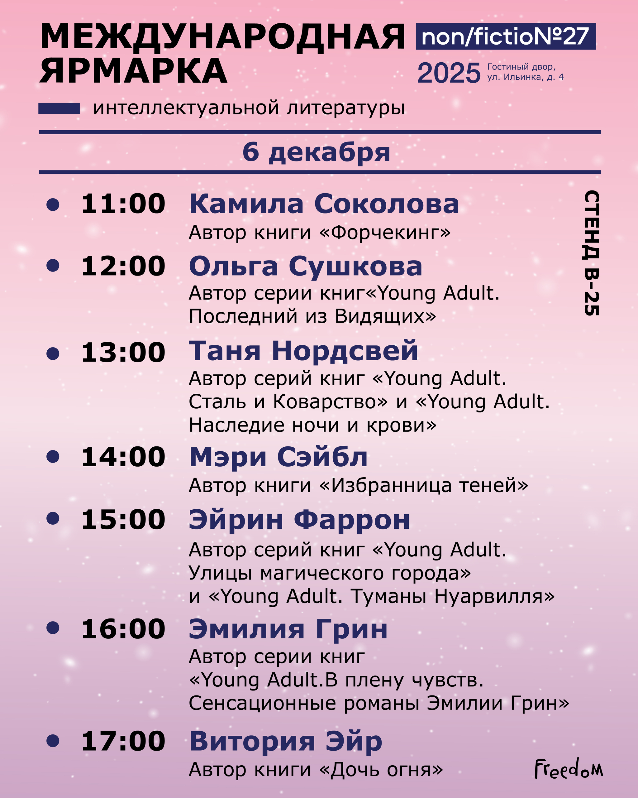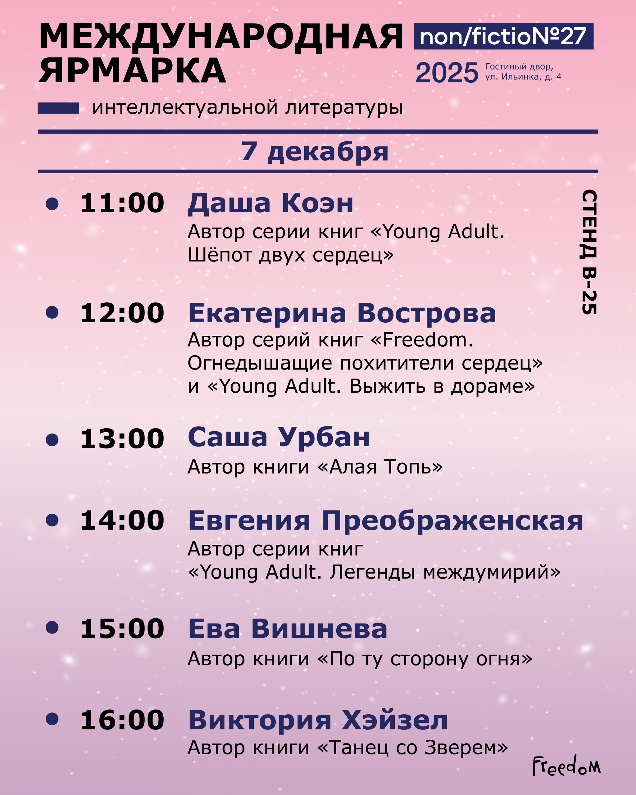 На стенде В-25 представлено издательство «Freedom». Ценители Young Adult литературы окунутся в романтическую сказку с новинками от популярных авторов. Здесь читателей ждут зимние любовные истории Лины Винчестер «Притворись моим на Рождество», Ники Сью «Поцелуй под снегом», Эмилии Грин «Укради мое сердце, Тайный Санта!». А также азиатское фэнтези Люциды Аквилы «Система для друзей» и заключительная часть спин-офф серии цикла «Караваль» о бесстрашной девушке и обольстительном Принце Сердец «Заклятие истинной любви». Но книги — только часть волшебства. На стенде Freedom можно найти много уникального мерча.
