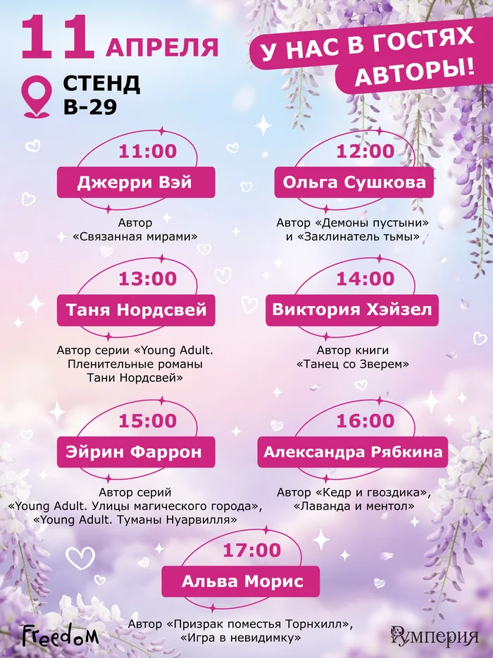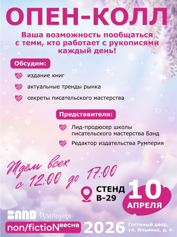 ● 10 апреля с 12 до 17 на стенде (В‑29) опен колл для авторов с представителем лид-продюсер школы писательского мастерства и редактором издательства «Румперия». Вы сможете задать интересующие вас вопросы по актуальным трендам рынка, изданию книг и секретам писательского мастерства. Это Ваша возможность пообщаться с теми, кто работает с рукописями каждый день!