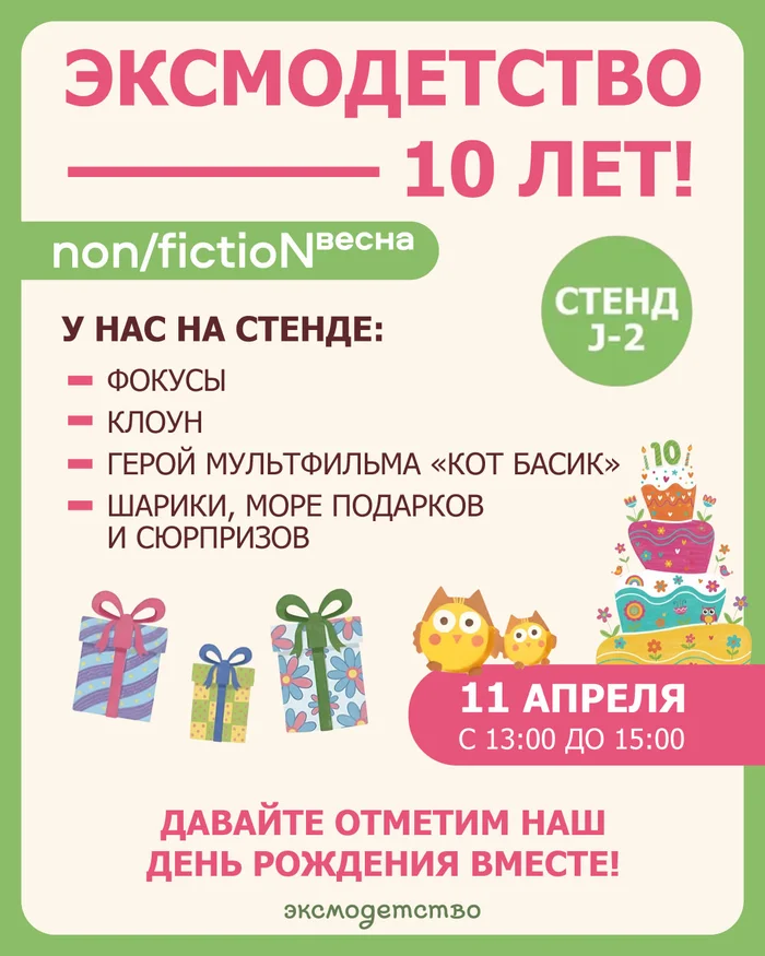 Главным событием детской программы станет празднование юбилея «Эксмодетства». 11 апреля с 13:00 до 15:00 на стенде J‑2 гостей ждет настоящий праздник, множество сюрпризов и подарков.