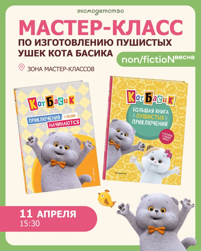 ● 11 апреля в 15:30 на площадке «Мастер-классы» — творческое занятие по созданию пушистых ушек Кота Басика. Каждый участник сможет своими руками сделать аксессуар и сфотографироваться с ростовой куклой любимого героя.
