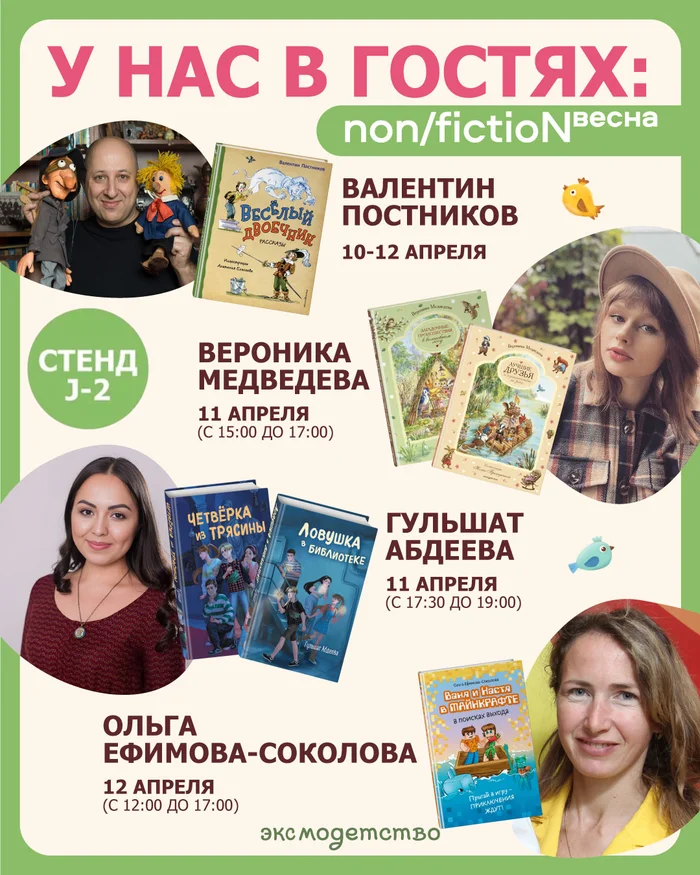 ● 12 апреля с 12:00 до 17:00 на стенде J-2 Ольга Ефимова-Соколова проведет презентацию своей книги «Настя и Ваня в Майнкрафте. В поисках выхода».