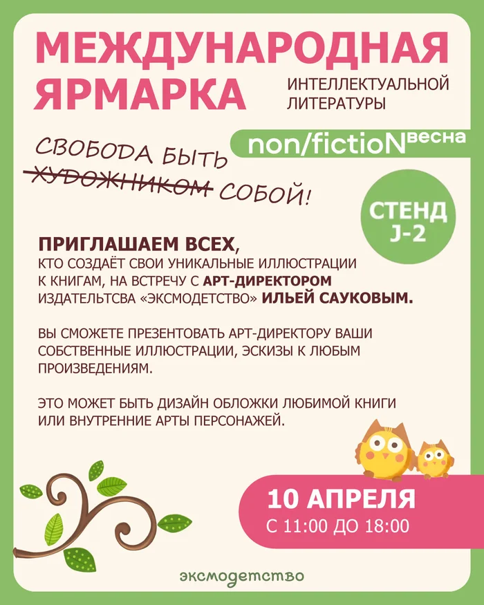 ● 10 апреля с 11 до 18 на стенде J-2 арт-директор издательства «Эксмодетство» Илья Сауков приглашает всех, кто создаёт свои уникальные иллюстрации к книгам. Вы сможете презентовать директору ваши собственные иллюстрации и эскизы к любым произведениям.