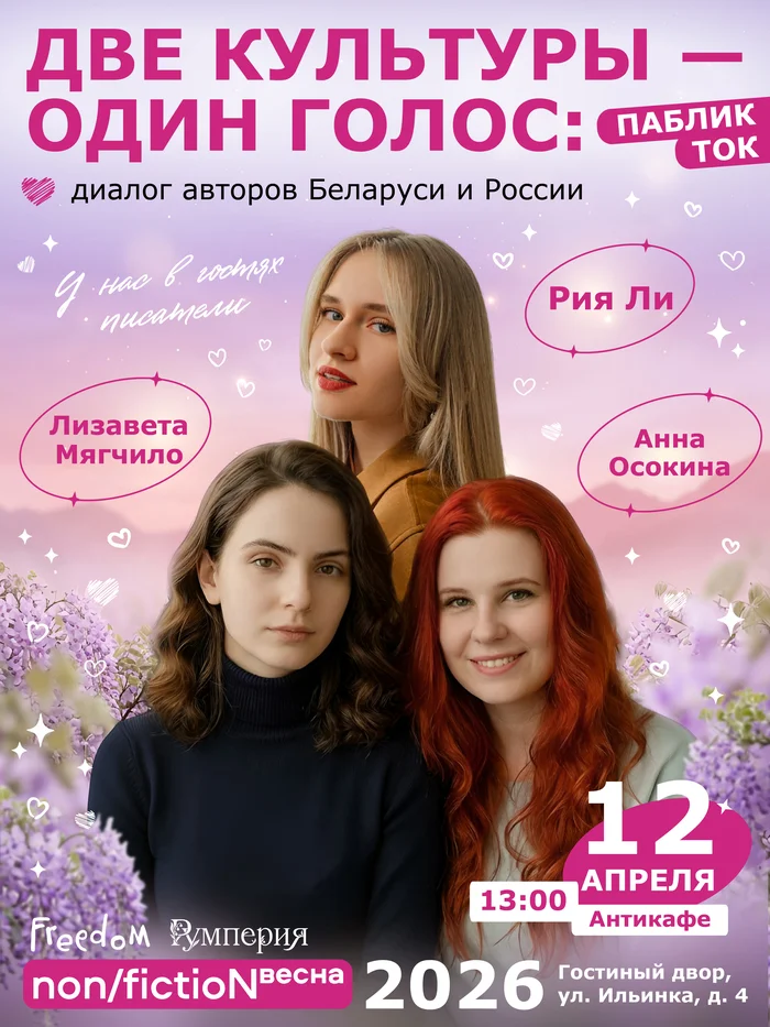 ● 12 апреля в 13:00 в «Антикафе» состоится паблик-ток «Две культуры — один голос: диалог авторов Беларуси и России». Участники — писательницы Рия Ли, Лизавета Мягчило и Анна Осокина — обсудят взаимовлияние белорусской и российской культуры, поделятся опытом творческого сотрудничества и расскажут о том, как их произведения объединяют сердца читателей из разных стран.