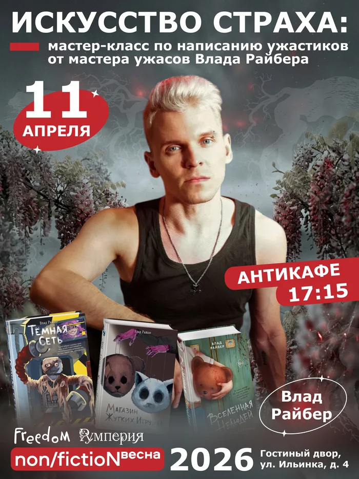 ● 11 апреля в 17:15 в «Антикафе» пройдет мастер-класс по написанию ужастиков от Влада Райбера. На встрече гости узнают секреты создания бестселлеров в жанре хоррор, получат ценные советы от мастера и смогут поделиться собственными историями.