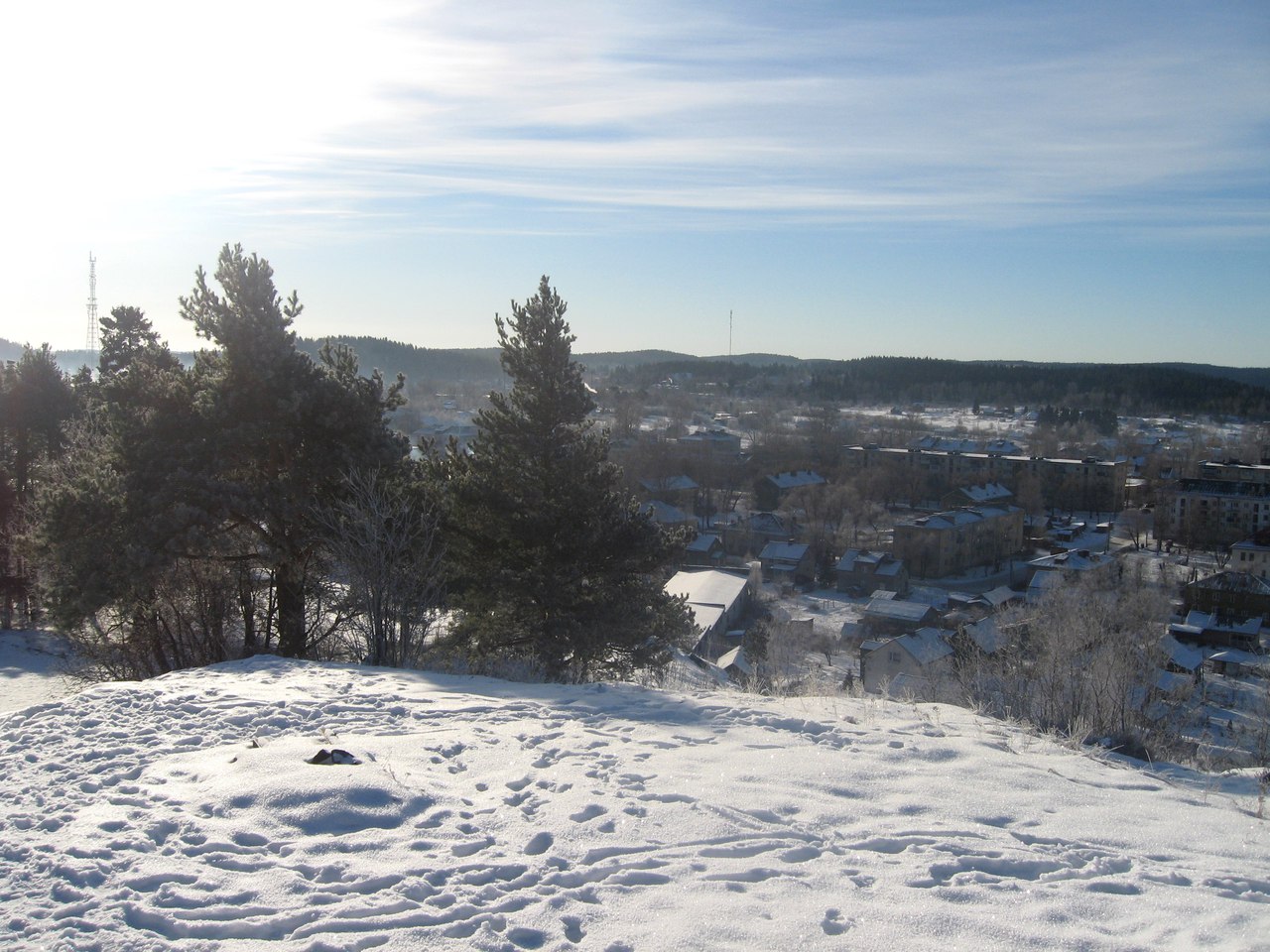 В Карелии, в центре города Сортавала, бывшего финского, а ныне российского, есть популярный городской парк, где по лестнице можно подняться на гору, на вершине которого - смотровая площадка с хорошим обзором. Зимой там - очень красивые северные виды. Смотрите сами!